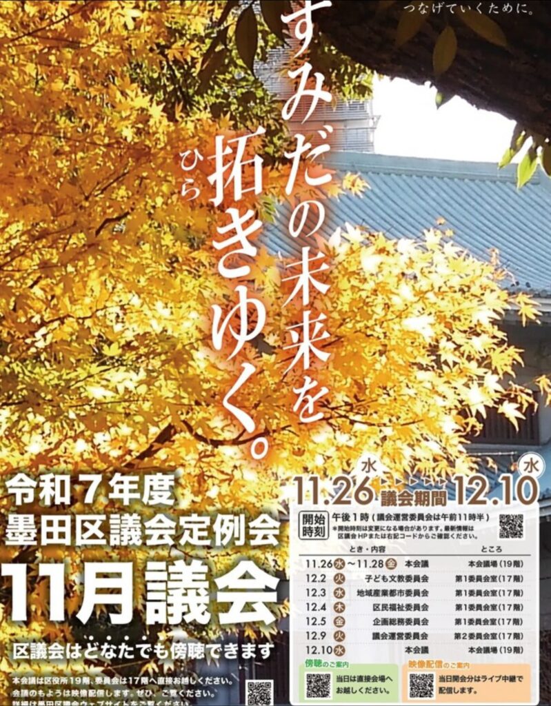 墨田区議会では、本日から令和7年度定例会11月議会が開会されます。民泊条例の上程等、大変重要な議会となります📝