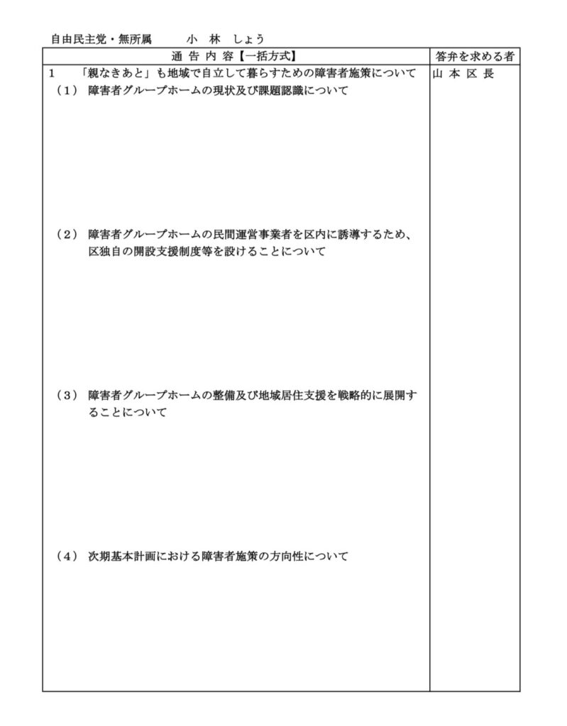 私はあす午後1時からの本会議にて、一般質問に登壇します。『障害者が”親なきあと”も地域で自立して暮らすために』をテーマに、区の障害者施策、特に「障害者入所施設の整備方針」について区長に問います。