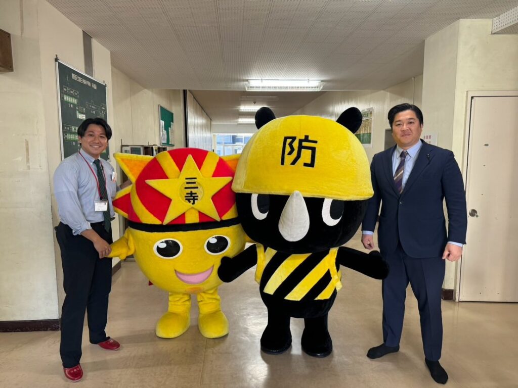 三寺小の「さんてらくん」とのレアなコラボ。写真を撮ったご家族には軒並み『東京防災ガイドブック』を手渡し、周知も忘れずに