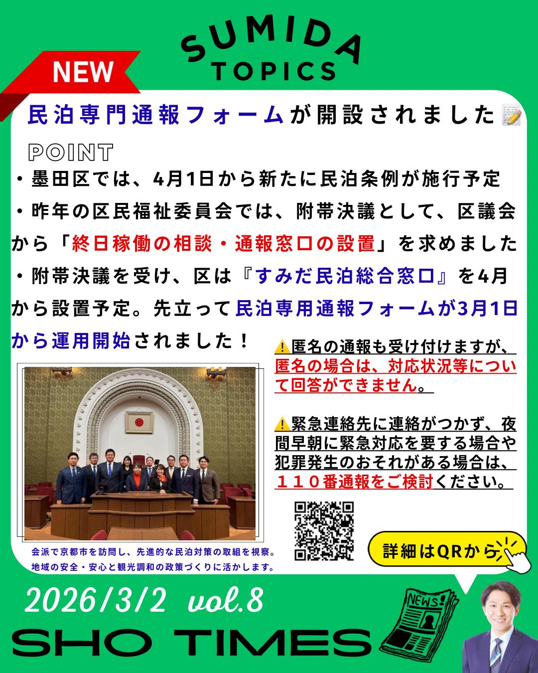 墨田区では、違法民泊等に対する監視指導体制の強 […]